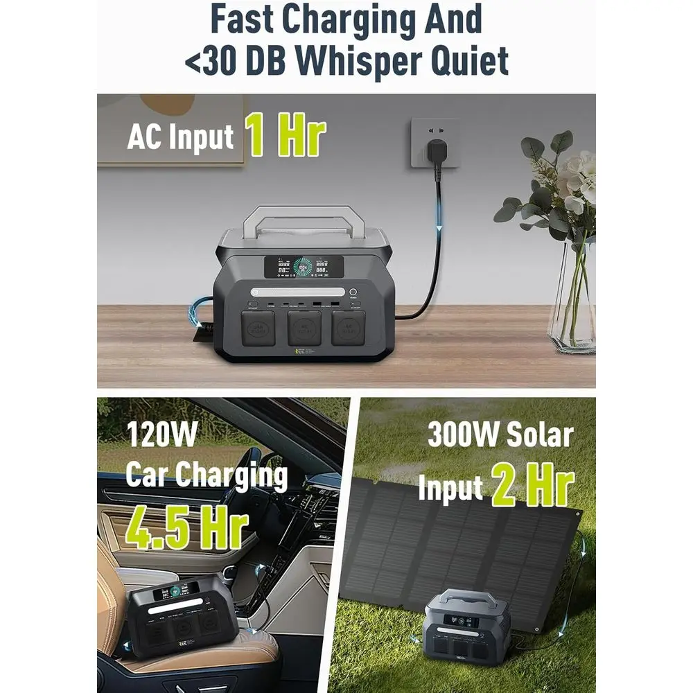 【1 Hour AC Recharge And Multiple Charging Options】Fast charging capabilities ensure the IEE P800 can be quickly replenished.Reach from 0% to 80% in under an hour and achieve full charge in 1.2 hours using AC wall outlet.Also supports both solar panels and car charging.You can recharge IEE P800 in 2.3 hours with 220W of solar input.IEE P800 also operates at a ultra quiet mode,controlling the volume to less than 25 dB at a distance of 1.5 ft,won’t disturb your peace.