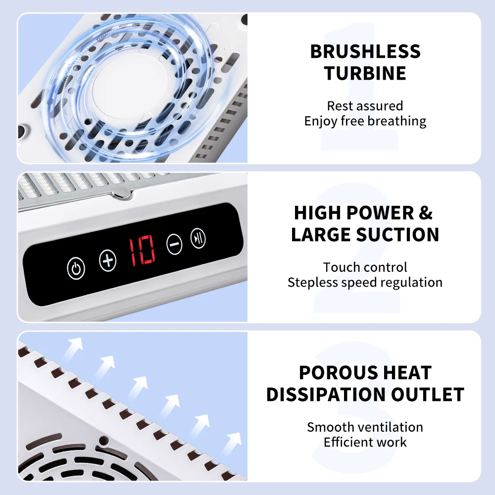 3.Touch screen design—- Nail Vacuum Cleaner has a touch button design on it, open the touch switch and long press for 2-3 seconds to use, easy to operate.
