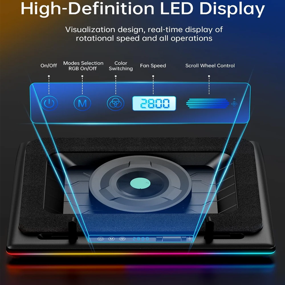 [HD LED Display + Touch Control Keys]Featuring a visual design, our laptop cooling pad offers real-time display of fan speed and lighting adjustments. With touch-sensitive buttons, you can easily select the desired fan speed, finding the perfect balance between cooling performance and noise levels.