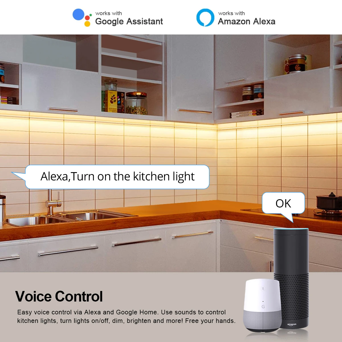 【Voice Control】 Control your smart led strip via your voice with Google Assistant . Just give a voice command to turn on/off or dim/brighten your light, even switch your light to specific olor as you need. No hub required and easy to install. No need subscription.