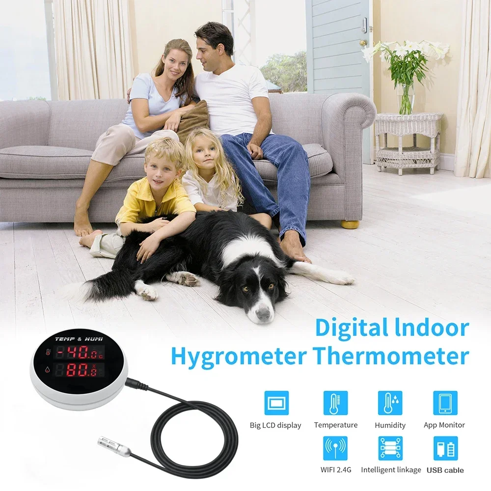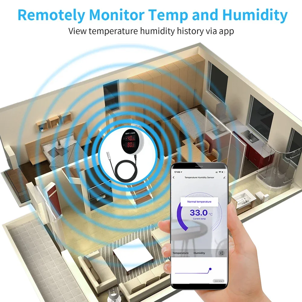 Smart WiFi Control:Easily monitor temperature in real time from anywhere,anytime. With an external waterproof temperature sensor probe,Detect temperature range is -40°F to +248°F (-40°C to +120°C).the hygrometer thermometer is proper for Freezer, Refrigerator, Fish Tank,incubators ect and detect water temperature.