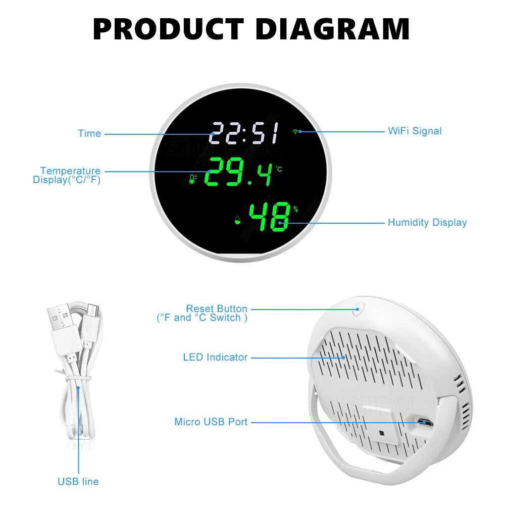 Tuya USB Smart Temperature Humidity Sensor WiFi APP Remote Monitor for Smart Home Smart Life, Works With Alexa, Google Assistant