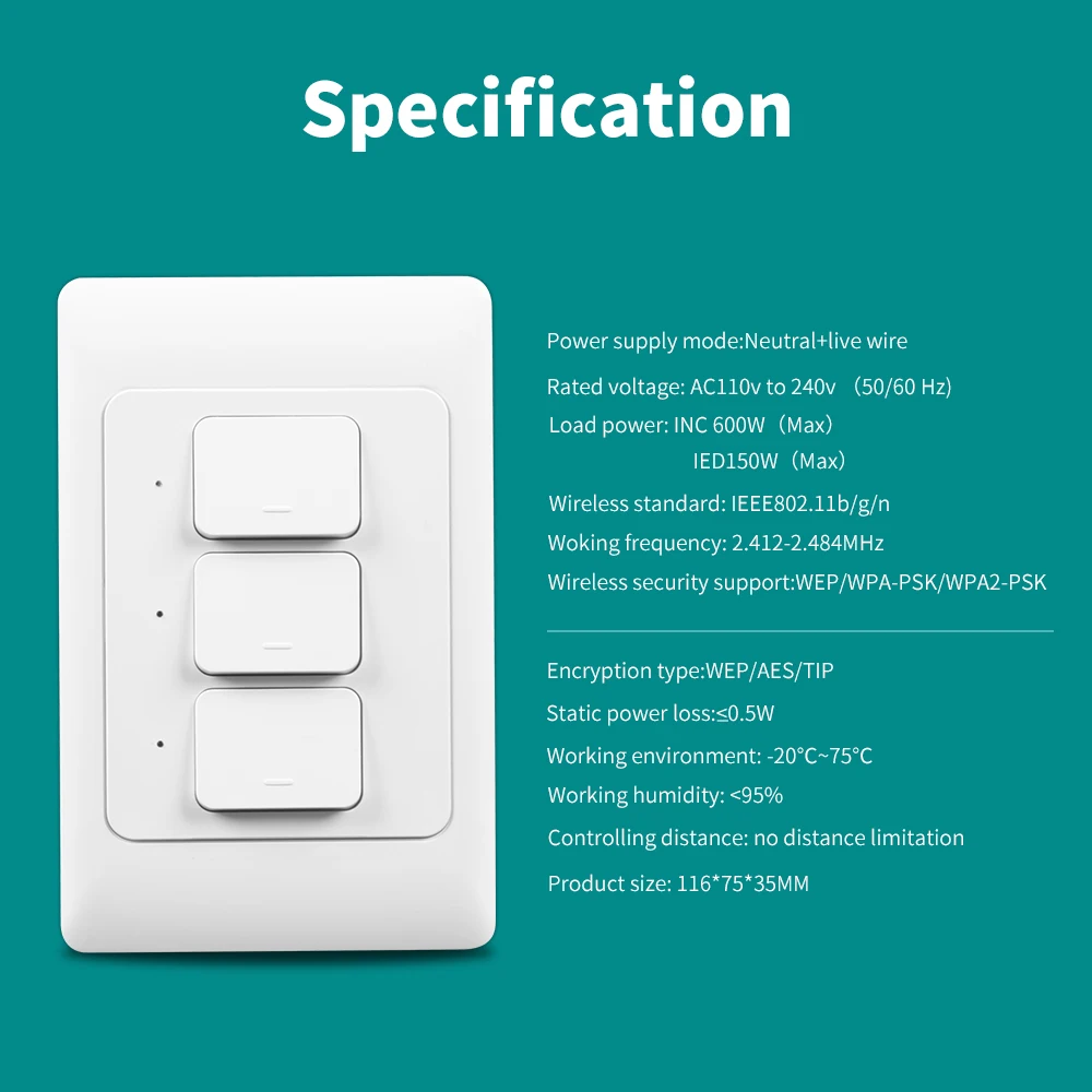 Tuya WiFi Smart Wall Light Switch No Neutral Wire &Neutral Wire Push Button Physical Light Switches US/AU for Alexa Google Home