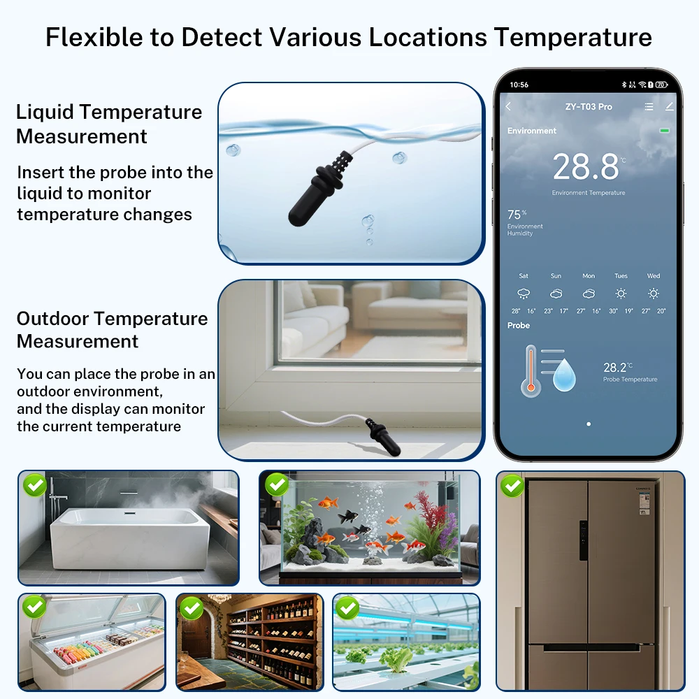 Whether it’s liquids, freezers, or outdoors, simply place the temperature probe inside to check the current temperature.