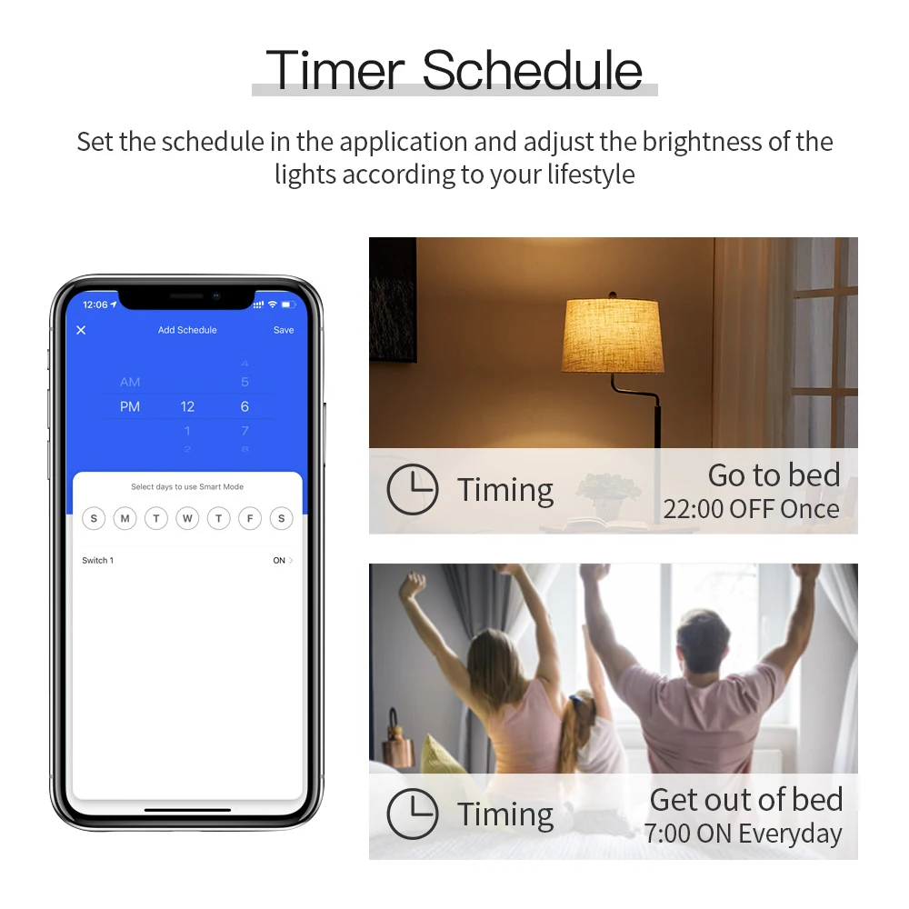 Timer Schedule: Create schedules to automatically turn the home appliances or lighting on/off. Helping you saving energy and electric fee.