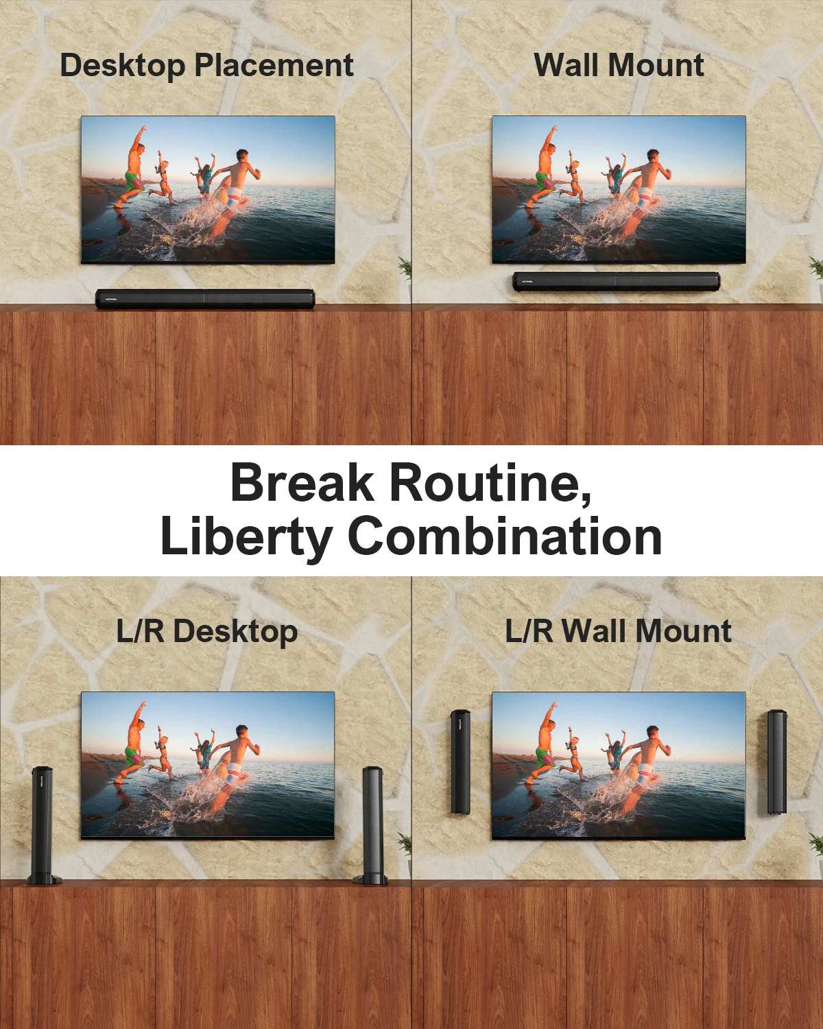 Detachable,multi-mountableways, and portable All-in-Onesoundbar for any combination with TV/PC/Computer/Laptop to suit changing needs and environments.