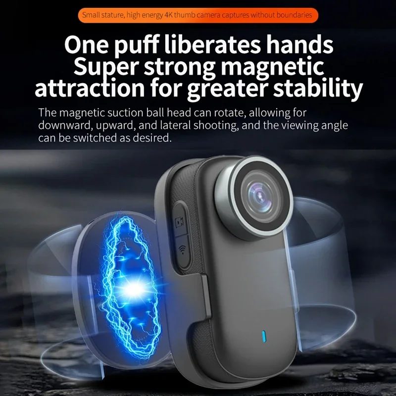 * Hands-Free: The 4K thumb action camera features a super-strong, non-contact magnetic attachment for enhanced stability. The magnetic ball head rotates for easy viewing from top to bottom, side to side.