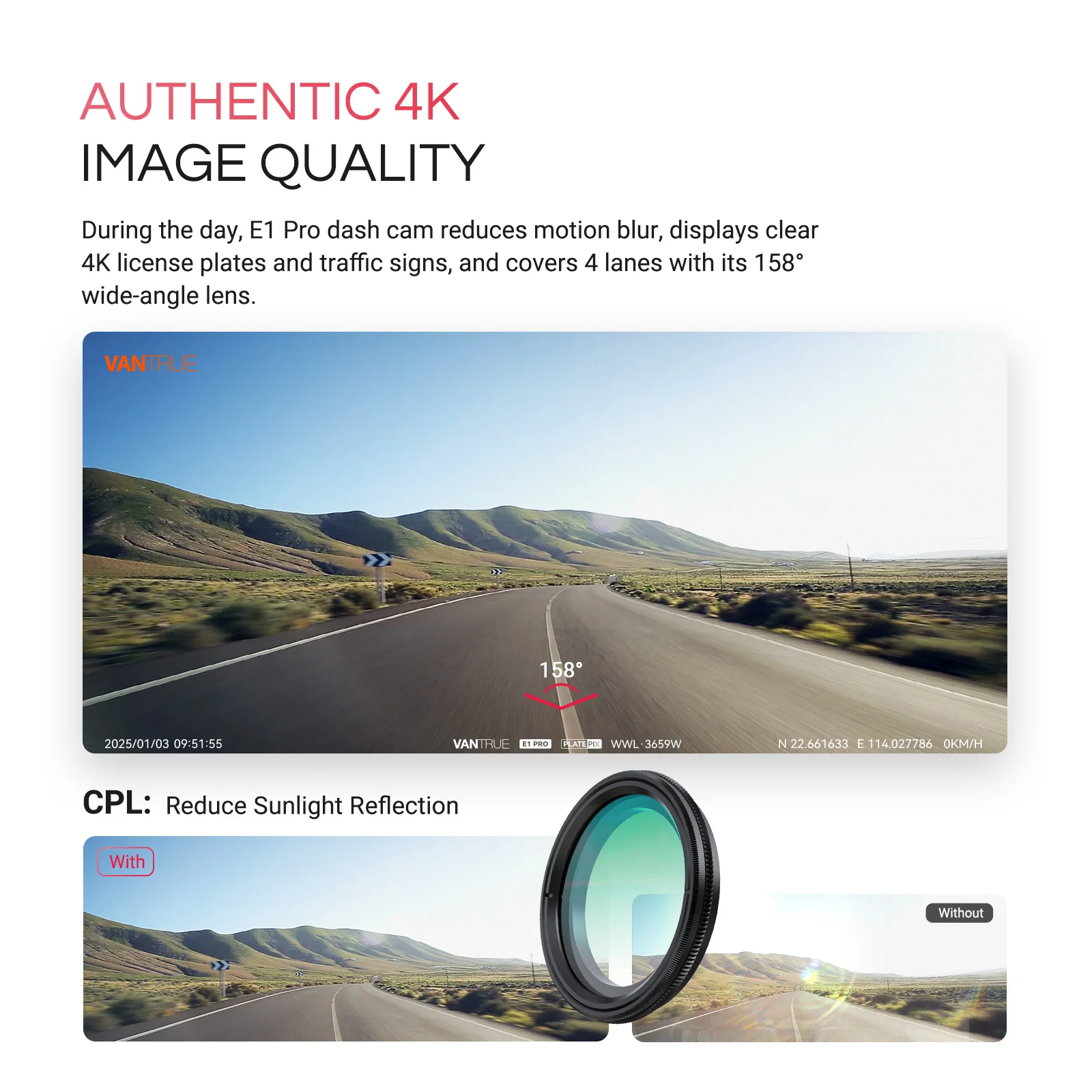 [Mini & 4K Mighty] Vantrue E1 Pro dash cam is equipped with Sony IMX678 sensor (8MP) that captures your journeys in breathtaking 4K 3840 x 2160/30FPS resolution! Featuring a wide 158° lens, it ensures no detail is missed—recording license plates, road signs, and pedestrians to provide crucial evidence for insurance claims. Car Camera E1 Pro’s compact design is roughly size of one-dollar coin, making it easy to hide on windshield. CPL Filter (included) effectively reduces sunlight reflection!
