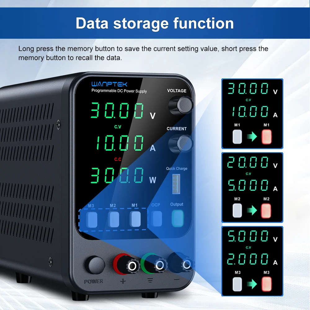 Wanptek’s new series of products. This model is a miniature switch DC power supply. The output voltage and current can be controlled and adjusted separately by the encoder, providing more convenience and accuracy in voltage and current regulation. The panel also provides high-precision three window digital display of voltage, current, and power, allowing users to intuitively see the current usage status and various parameters of the machine. Three sets of stored data are provided for easier operation,