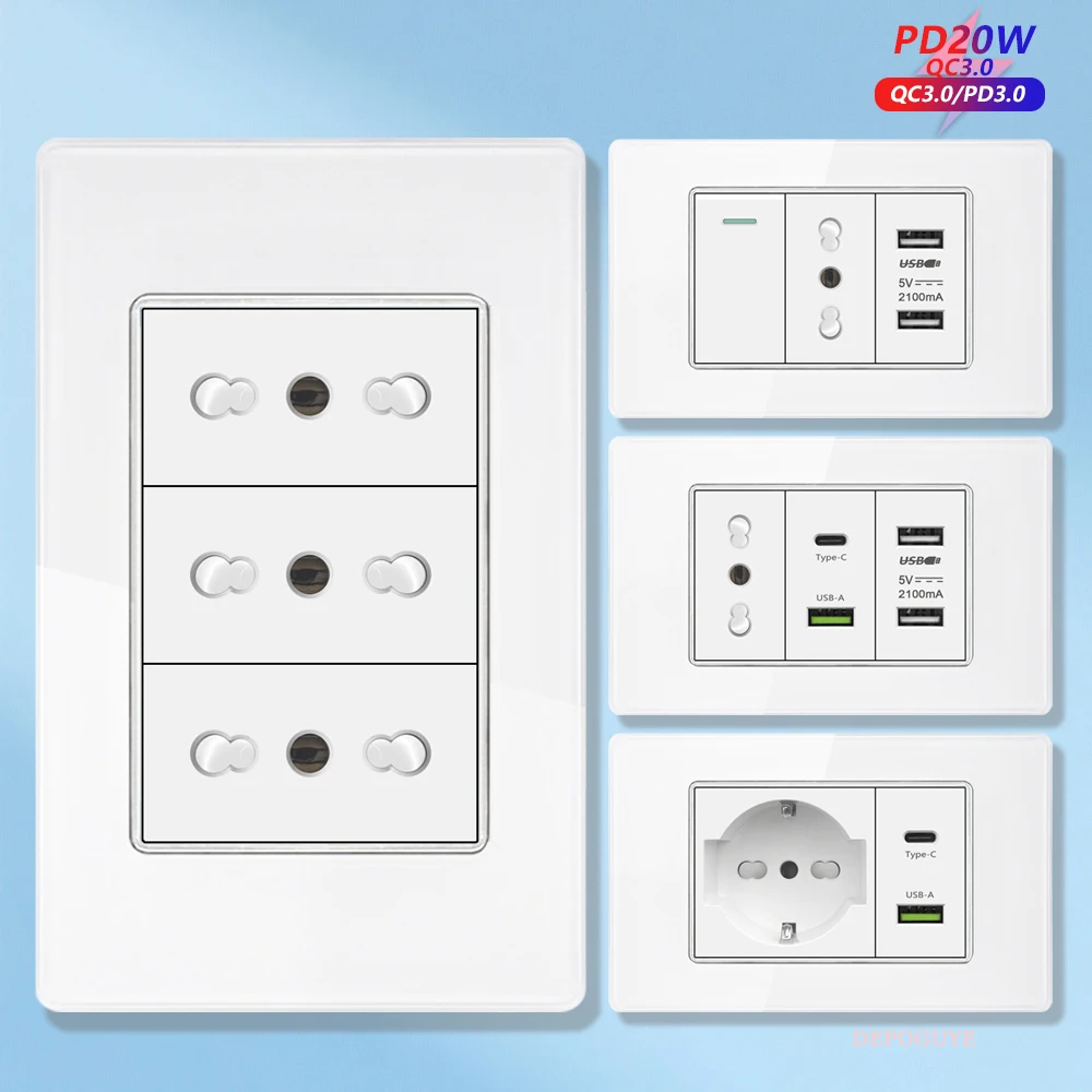 White Tempered Glass Italy USB Type C Smart Fast Charging Wall Socket Plugs Schuko Light Switch Panel Chile TV Sat Computer CAT6