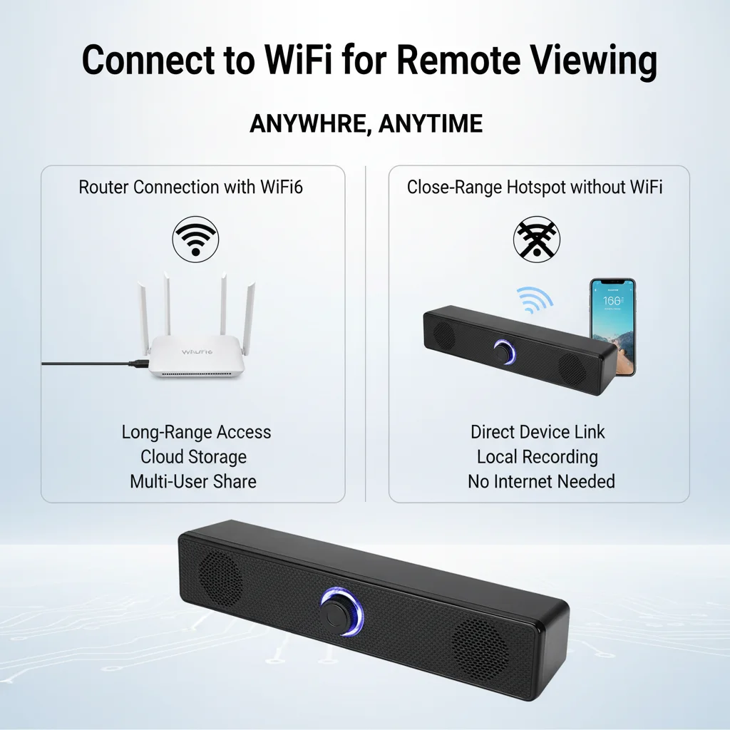 **Parameters**: 4K UHD resolution delivers sharp, detailed videos at 20fps. 100° wide-angle lens covers broader areas, ensuring no blind spots indoors. Optimized WiFi 6 technology supports both AP hotspot mode (direct local connection without router) and stable router connection, enabling remote real-time viewing via mobile app. Local storage supports up to 512GB SD card (Not Included) with H.265 encoding, storing 3x more footage than standard formats for extended recording.