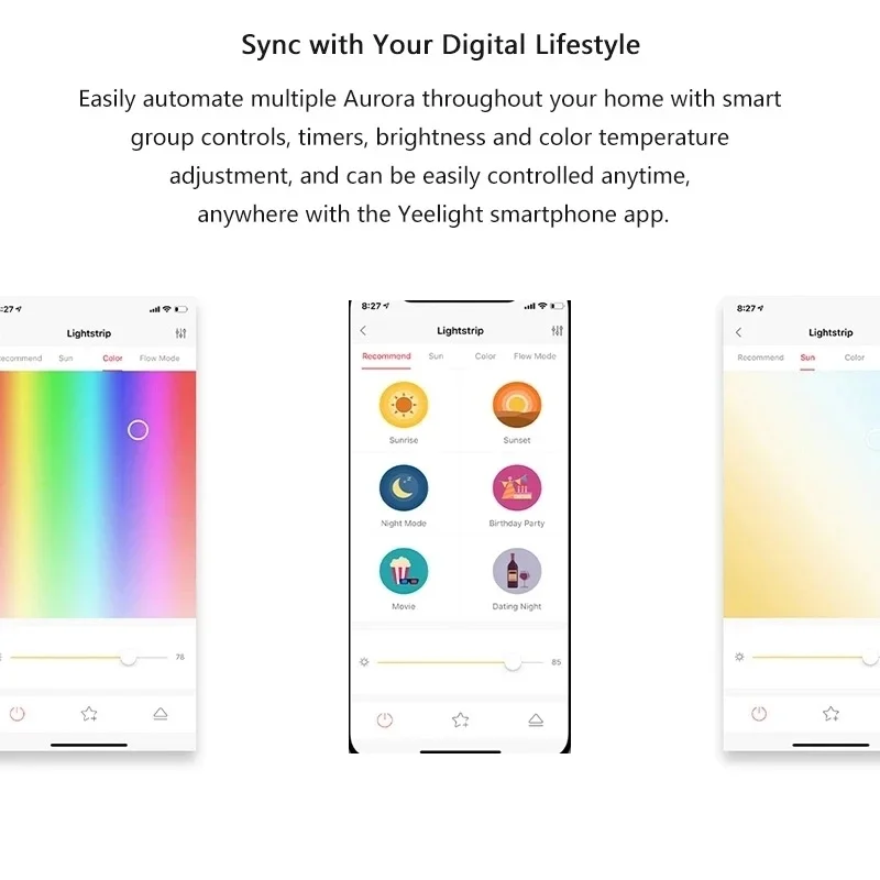 Easily automate multiple Aurora throughout your home with smart group controls, timers, brightness and color temperature adjustment, and can be easily controlled anytime, anywhere with the Yeelight smartphone app. |