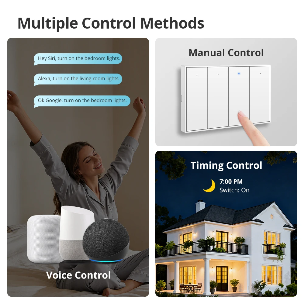 Smart Home Light Switches can be controlled remotely using your phone, and devices connected with switches can work independently. Even if you are not at home, you can use the mobile app to remotely control the device from anywhere and control the lights on/off at any time.