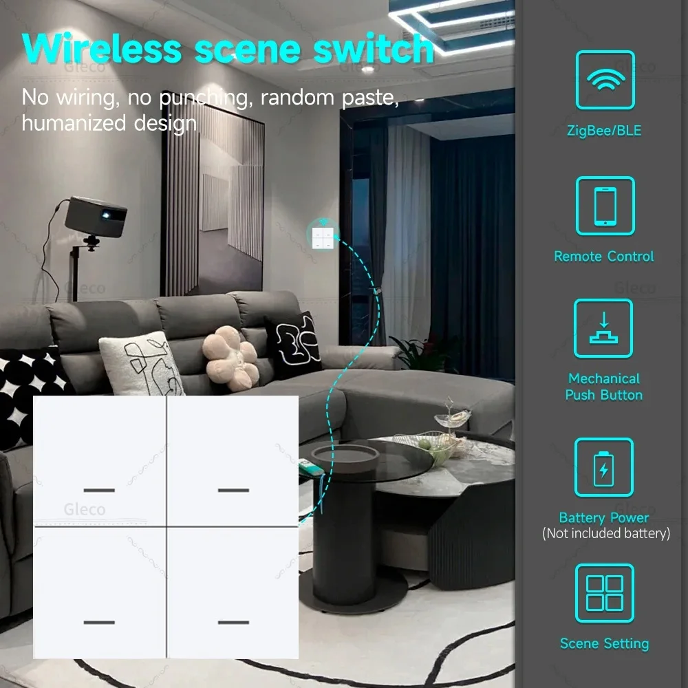 This Scene Switch is a battery-powered device based on ZigBee communication. After connecting to a ZigBee gateway and adding it to the Smart Life App, you can easily set scenes for different rooms or activities, such as Reading or Movie mode.