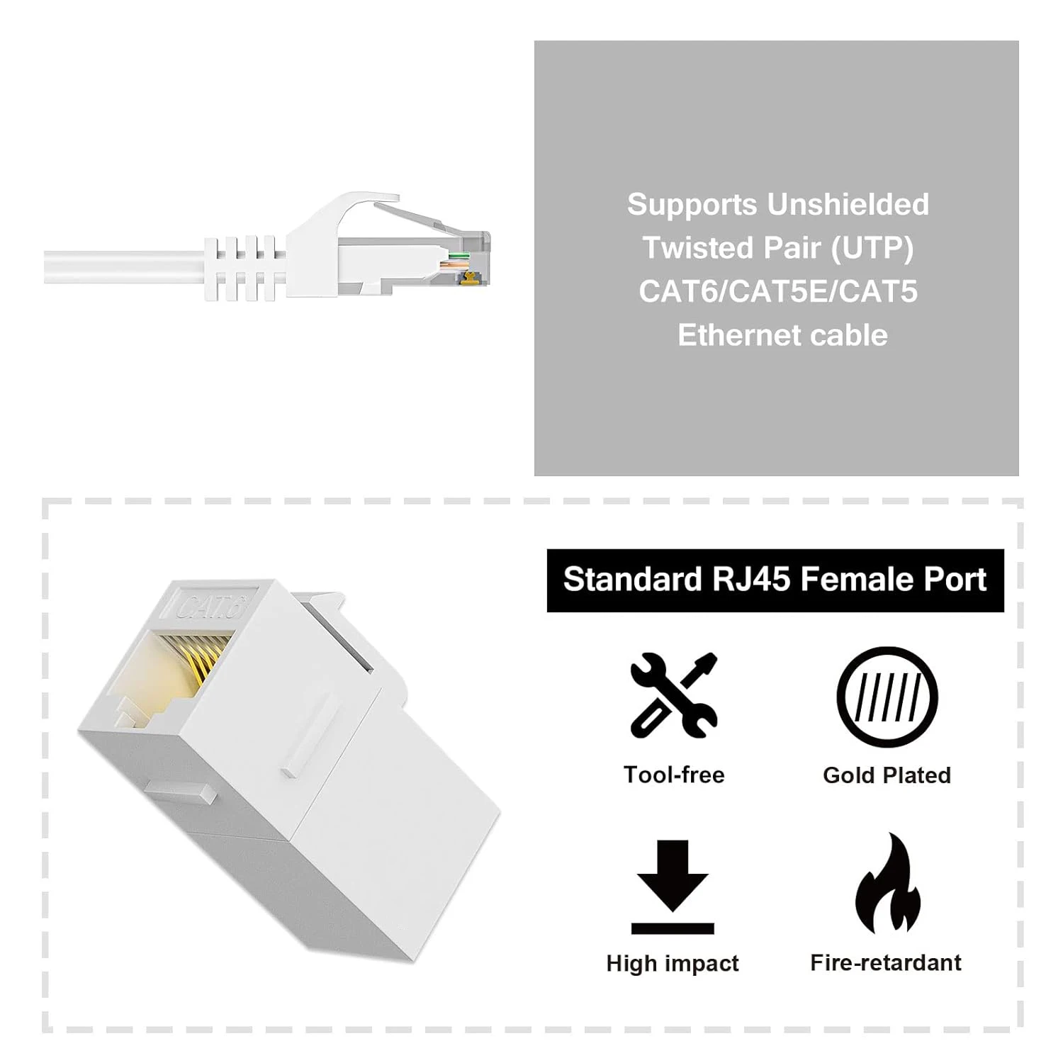 Unshielded Cat6 Female to Female keystone jack can be used connect two Cat5e/Cat6 Ethernet network cables.